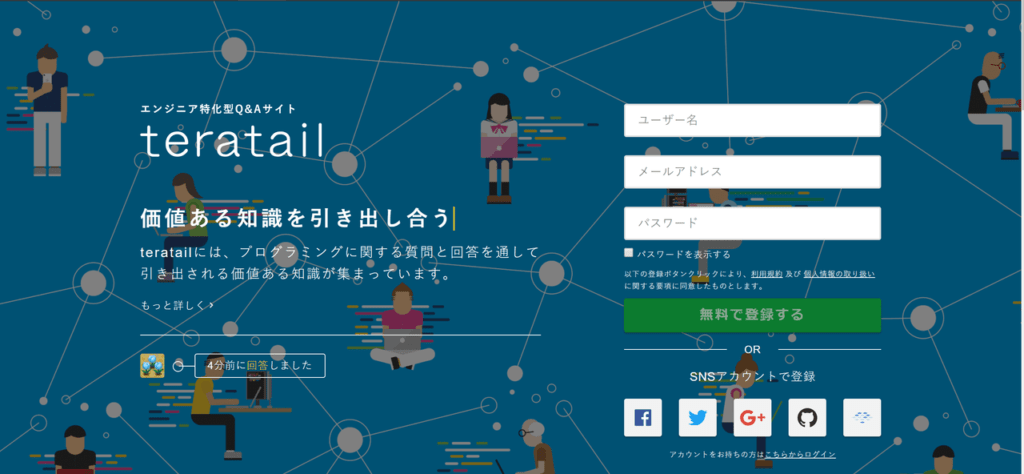 teratailはプログラミングに関する質問を投稿できるサイトです。teratailを利用している多数のエンジニアに回答を求めることができます。